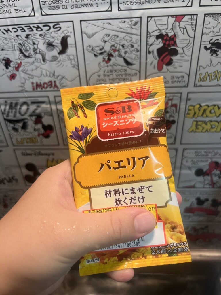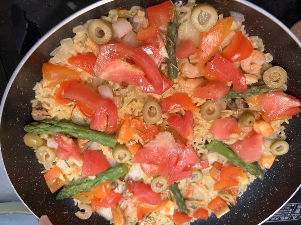 サフランで色づかせたお水でコンソメなどで味を調えて煮るので意外とそもそものレシピがシンプルなんですが、今回はパエリアの素が実はずっと宝物のようにとってあったので使用。