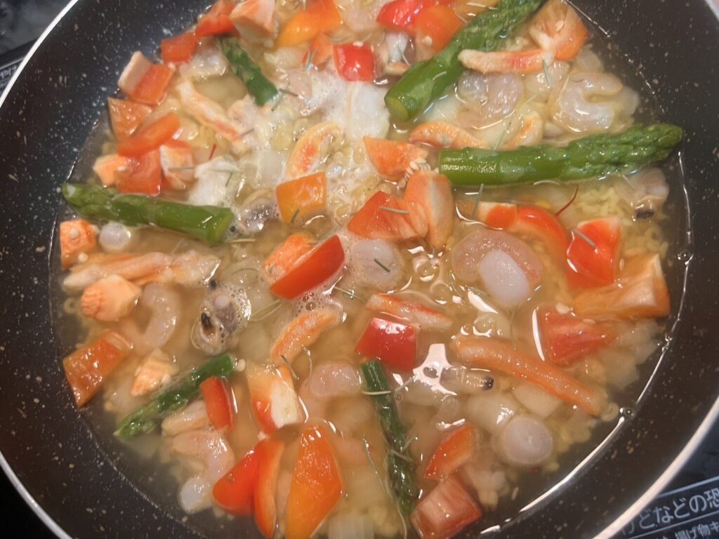 色水()をそそいだら、シーフードやパプリカ、アスパラなんかをちらしていきます。