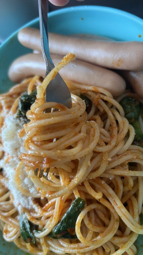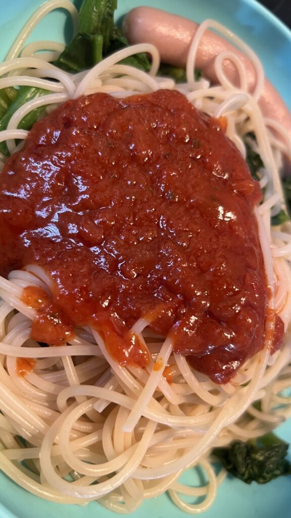 ちょっと粉チーズかけたり別でミネストローネあっためたりしたので写真上では薄くぱさぱさっぽく見えていますがたっぷり濃厚なトマトソースが十二分に味わえます!!