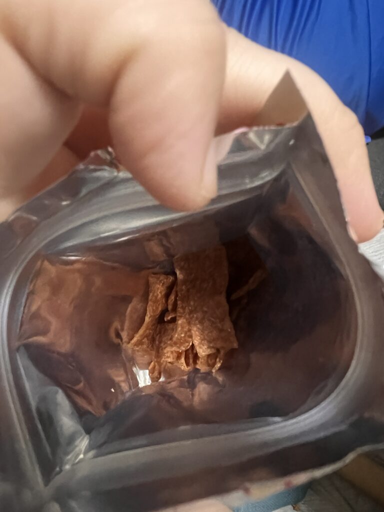 ジャーキーみたいなやつかな?あれっポテチみたいなちっぷなのかな?という視覚的な印象もありますが食べてみるとフニャッとソフトなジャーキー。