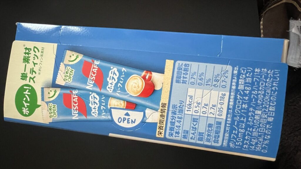 飲んだ感想は「おー結構甘い!」ハーフでもしっかりした甘さがあり、ほんのり香ばしいコーヒーの香りと相まって物足りなさはありません。個人的には非甘党なのでお湯を倍くらいにしても薄いということもなく美味しく頂ける気がします。1箱に26本とたっぷり入っており本数は4製品の中で一番です。