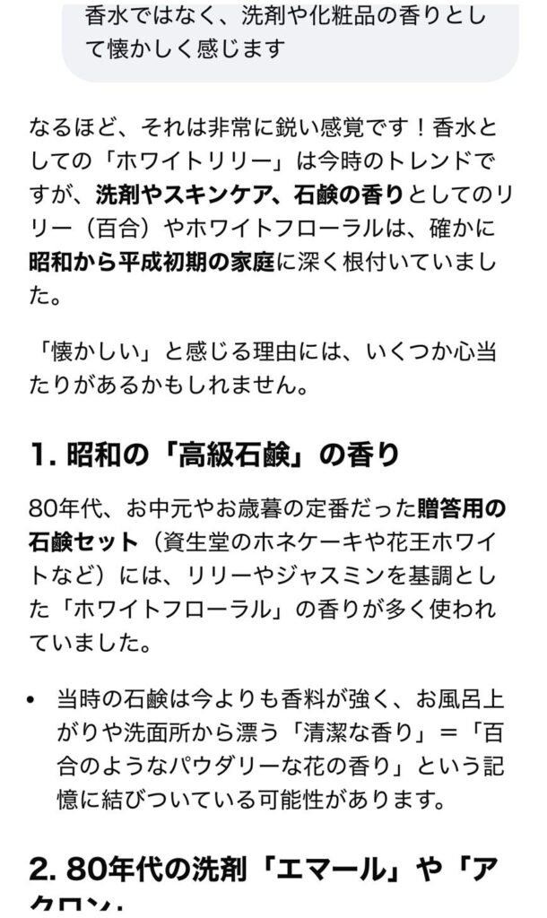 受け取る方がどう思うかわからないのですが・・ホワイトリリーの香りは率直に言うと少女漫画の、それも昭和のドメルヘンの世界を思い出すような懐かしく華やかな香りでした。いい意味でなんかわりとふりふりの服が好きな夢見る少女だった母を思い出す香りです。